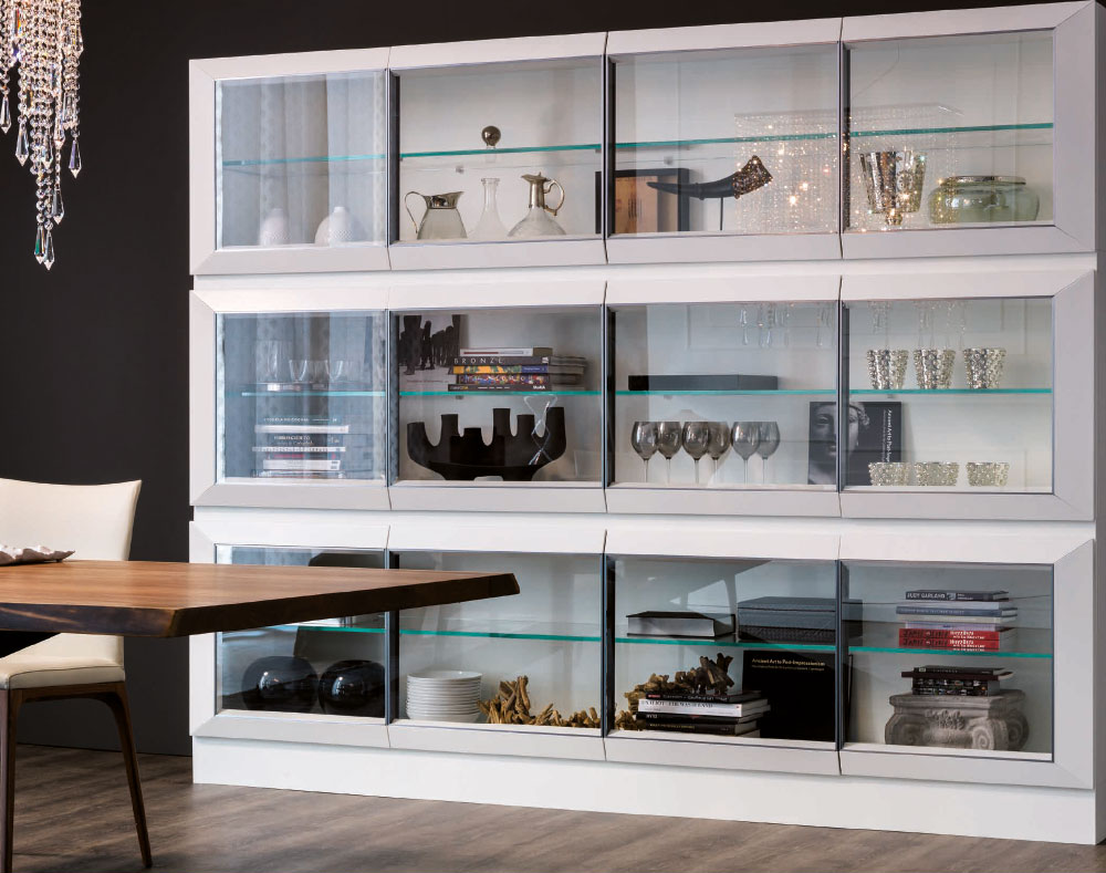 La versatilità di questa soluzione è ulteriormente aumentata dai divisori GHOST, che ripartiscono lo spazio interno dei vani a giorno con sottili elementi di vetro o lamiera.